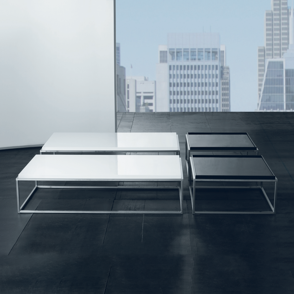 The Block Coffee Table is a modern and elegant piece, with a metal structure and a base available in aged steel, veneer, or paint. The top can be in lacquer, veneer, or clear glass, while the bottom offers options with no top, lacquer, veneer, or clear glass. Ideal for those seeking a versatile and sophisticated design.