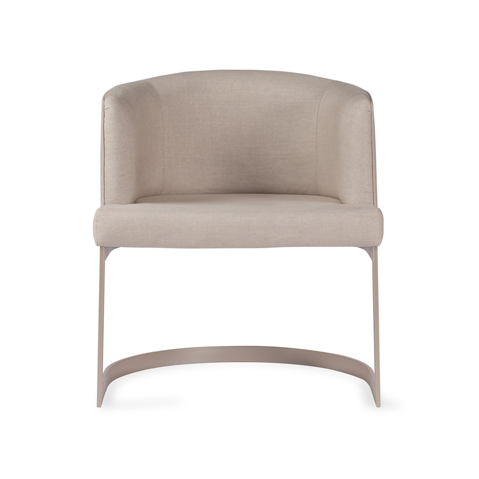 With curved lines and a striking structure, the Finn chair expresses modernity with subtlety. Its enveloping backrest and generous seat, both upholstered in fabric, provide comfort with elegance. The steel base outlines a light and sophisticated silhouette, making this piece an invitation to comfort with a sculptural presence.