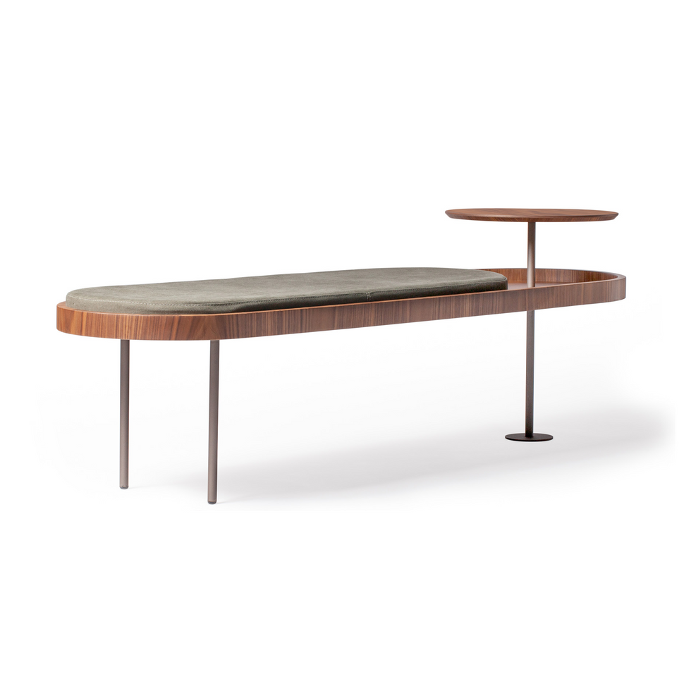 The Posh bench is the embodiment of contemporary design with a welcoming soul. Its curved upholstered seat harmonizes with the integrated side table, creating a functional and strikingly elegant ensemble. The wooden structure and steel legs highlight the sophistication of the details, making it an ideal piece for spaces that value style, comfort, and originality.